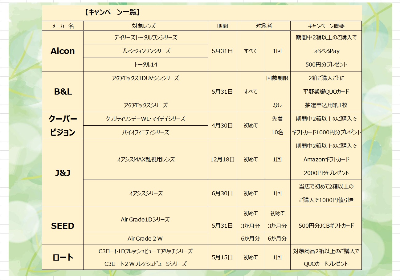 お得にコンタクトレンズが買えるキャンペーン一覧 お知らせ 2025.07.032026.04.06 現在実施中のコンタクトレンズご購入時のキャンペーンをお知らせいたします。 ・アルコン春の新生活応援キャンペーン・B&Lアクアロックスシリーズプレゼントキャンペーン・クーパービジョン春のはじめてキャンペーン ・J&Jオアシスシリーズ・MAX乱視用モニターキャンペーン ・SEEDAirGradeシリーズご購入キャンペーン・ロート春のプレゼントキャンペーン です。